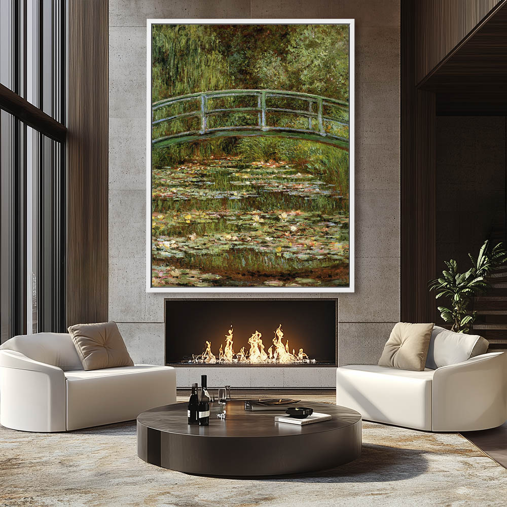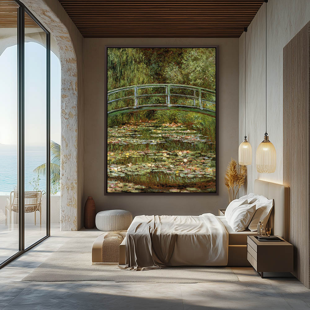 Vintage Garden Landscape Painting witrh a Japanese Bridge over a Pond with Lilly Pads