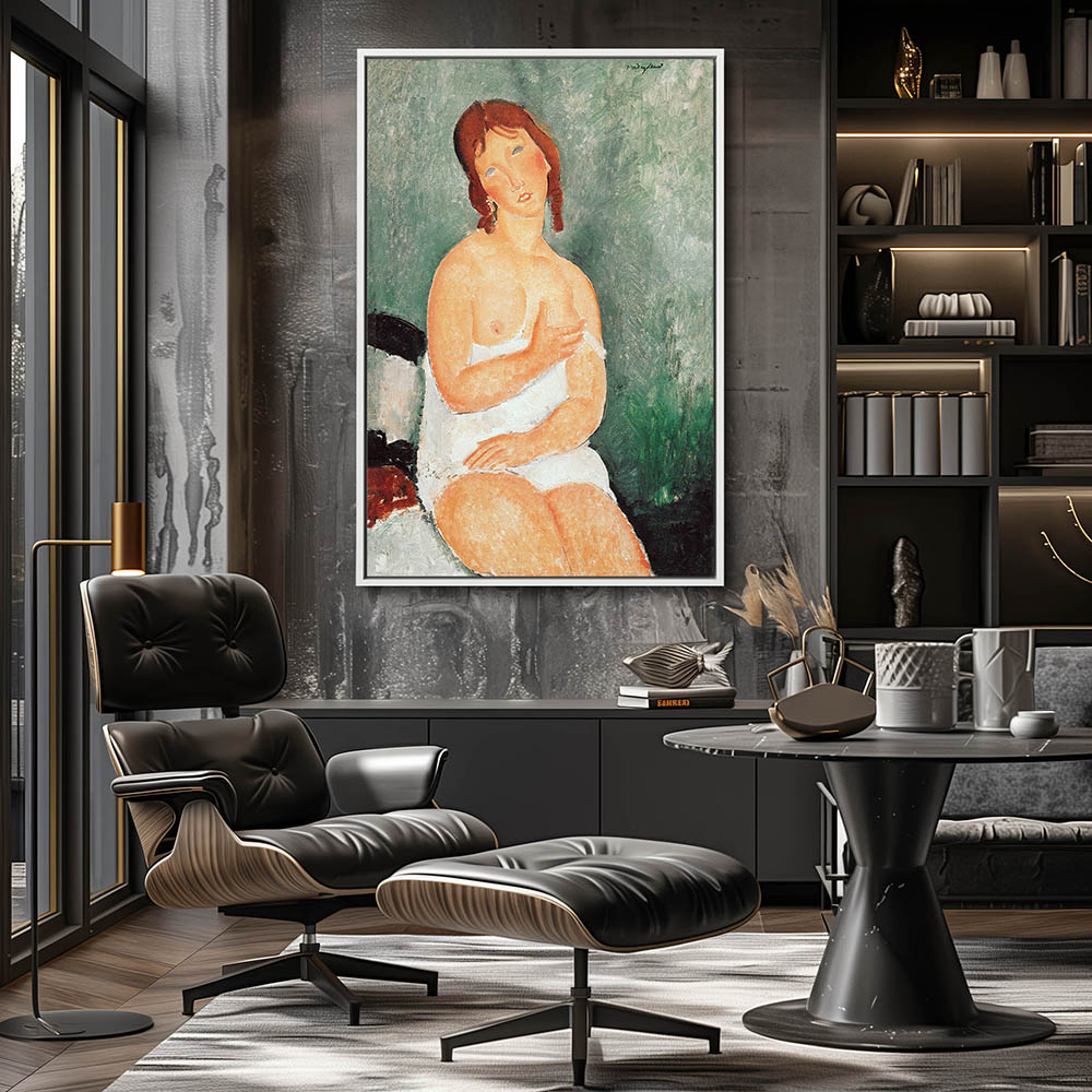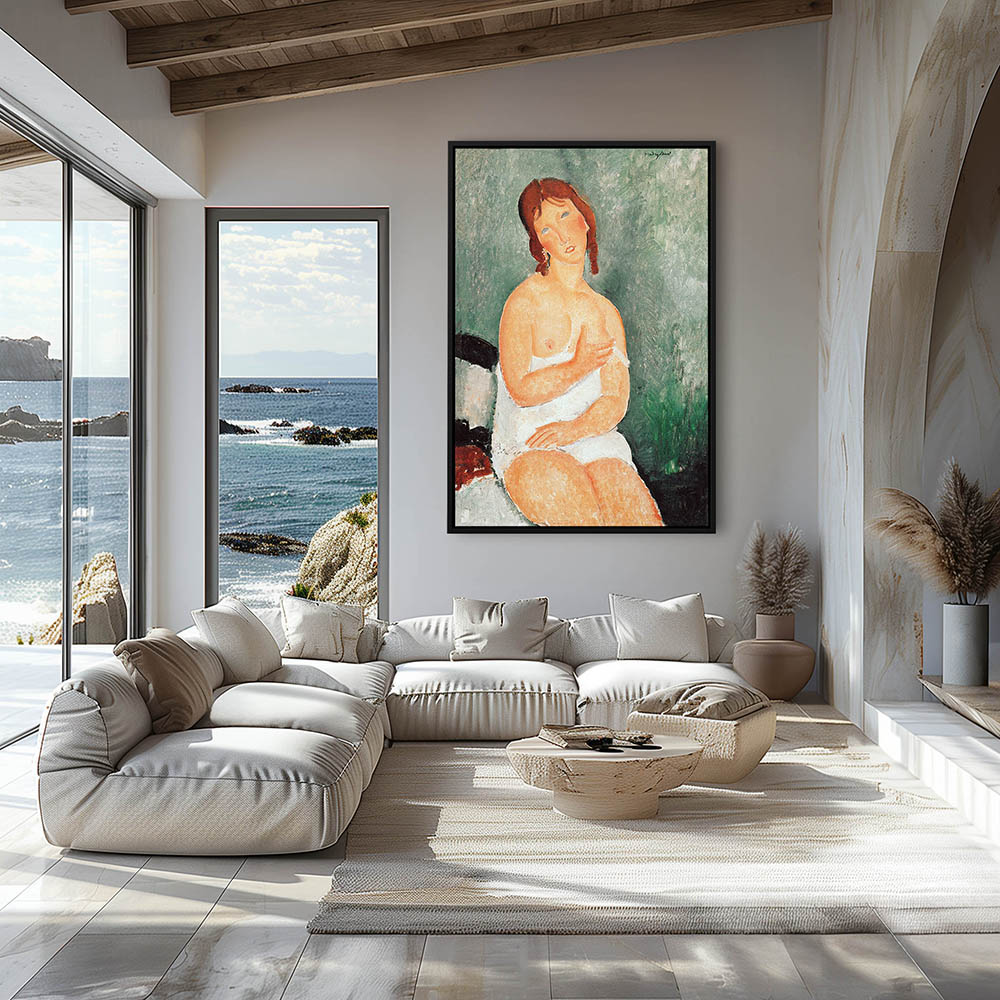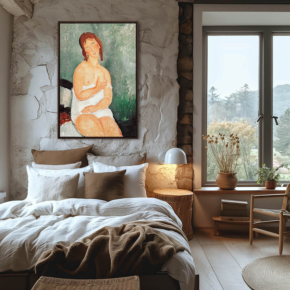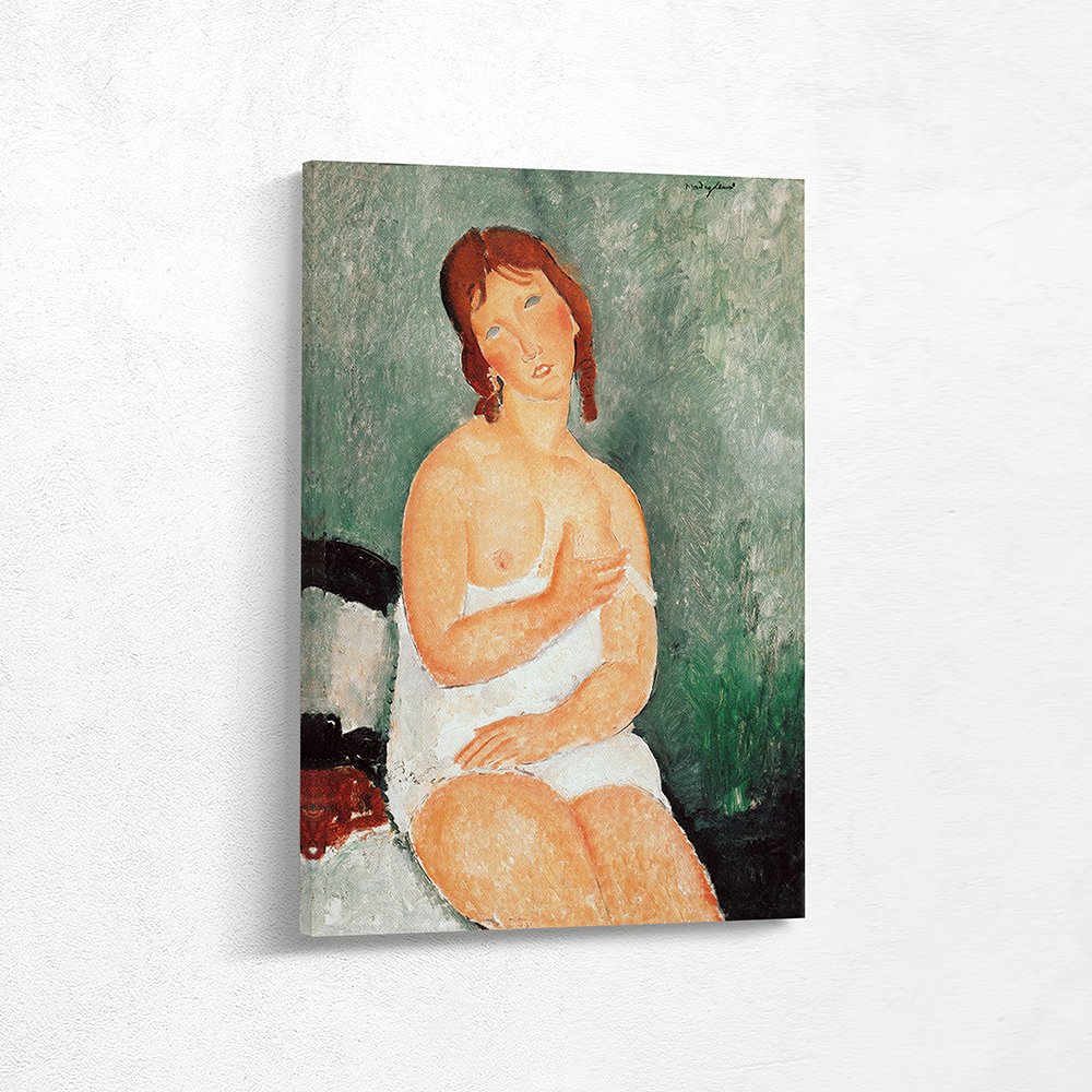 Abstract Figurative Painting of a Half Nude Woman Sitting on a Bed