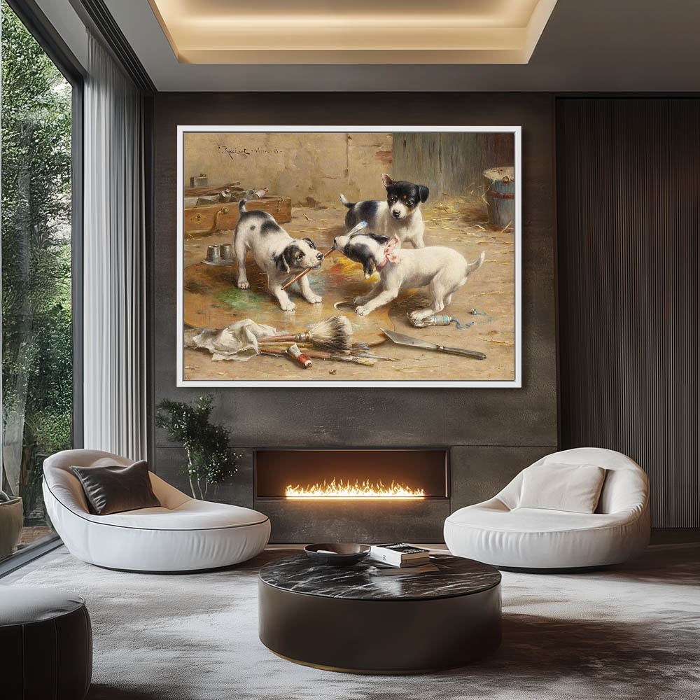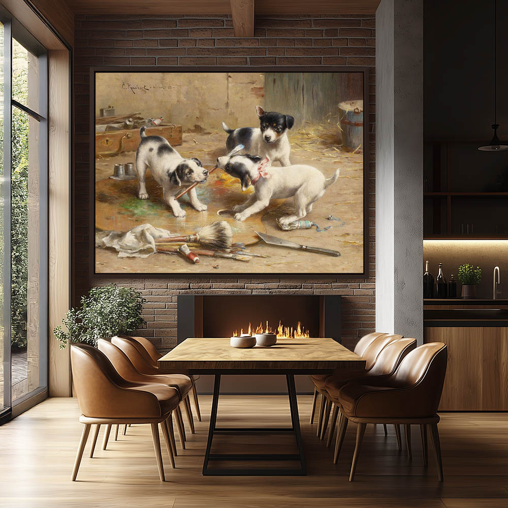 Puppies playing in painter’s supplies, fighting over a paint brush