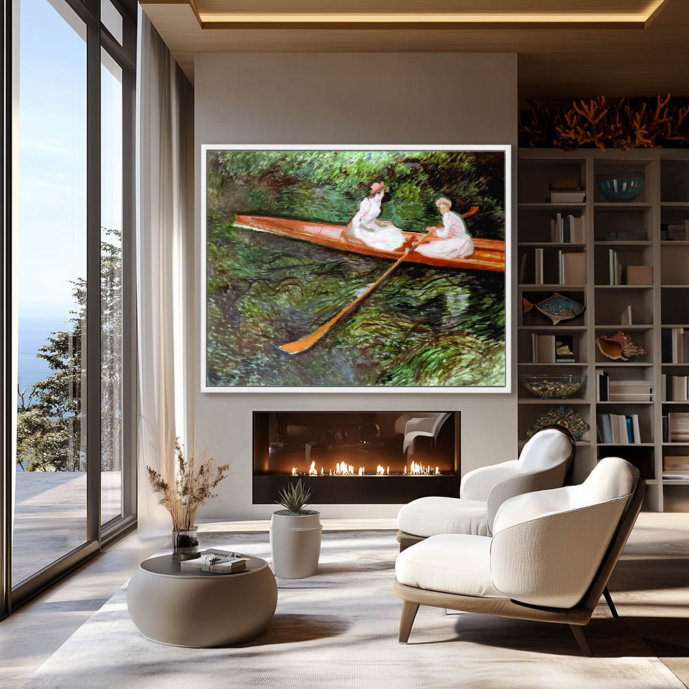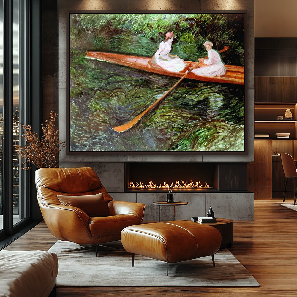 Vintage River Landscape Painting with two Girls Rowing in a Skiff