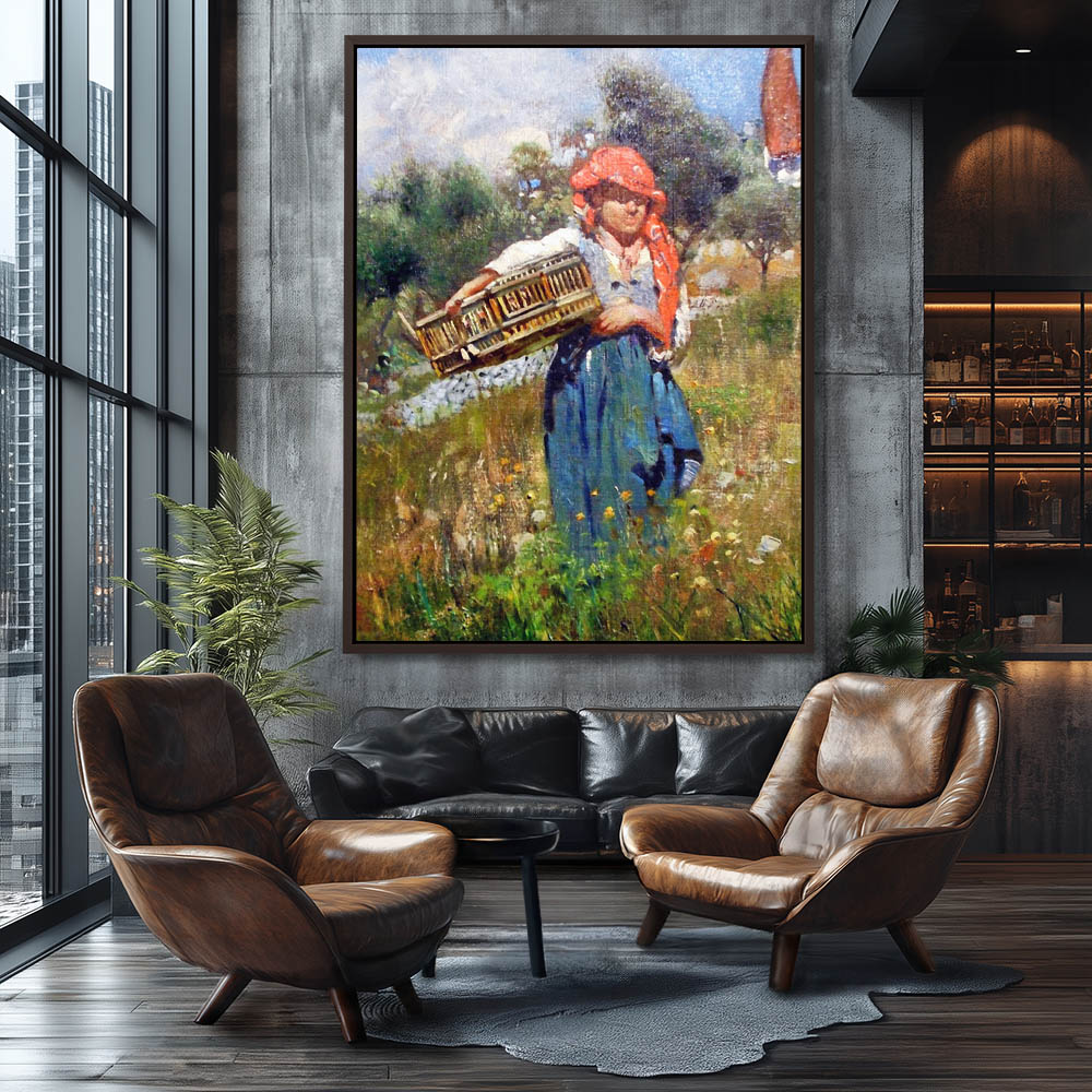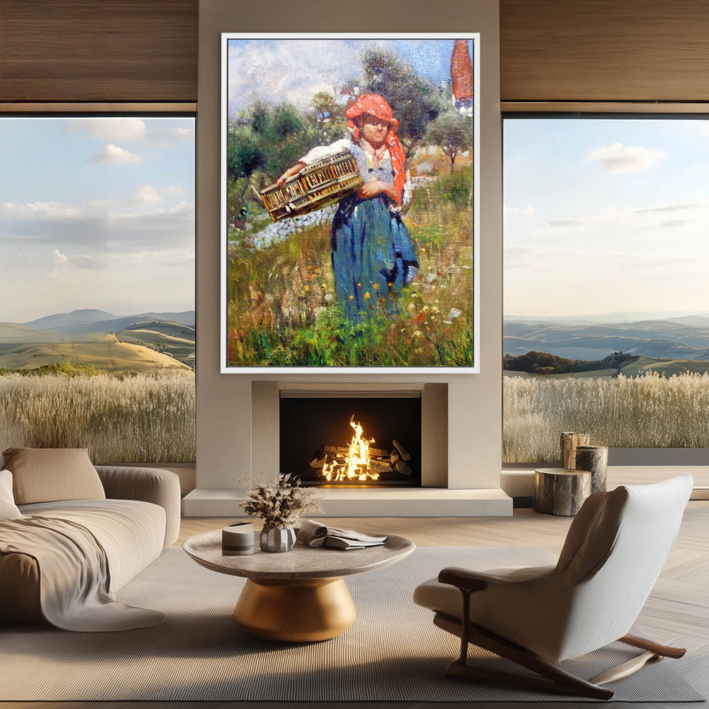 Figurative Painting of a Girl Carrying a Basket through a Field