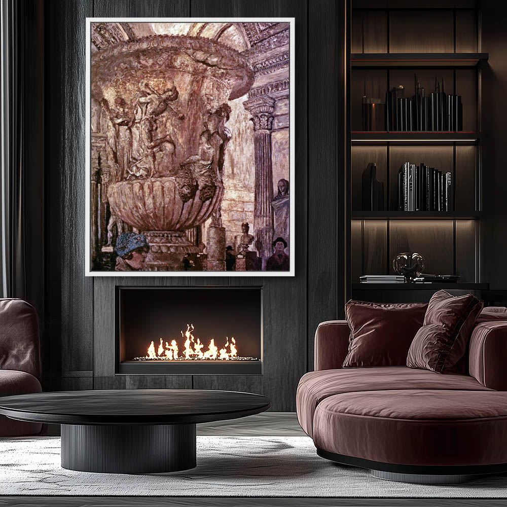 Interior of the Louvre with figures about and grand sculptures and architecture
