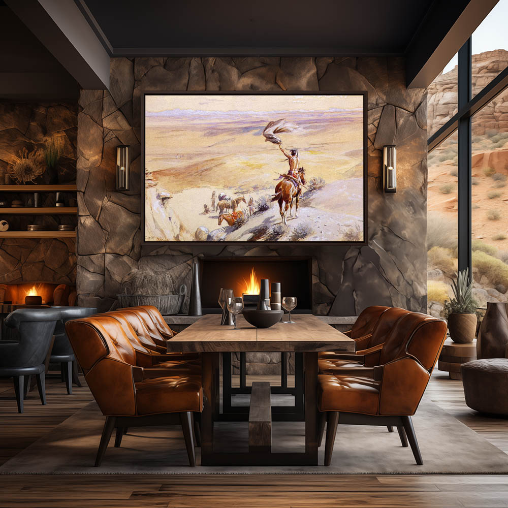 Indian on a hilltop signaling to others in the distance with the wave of a blanket