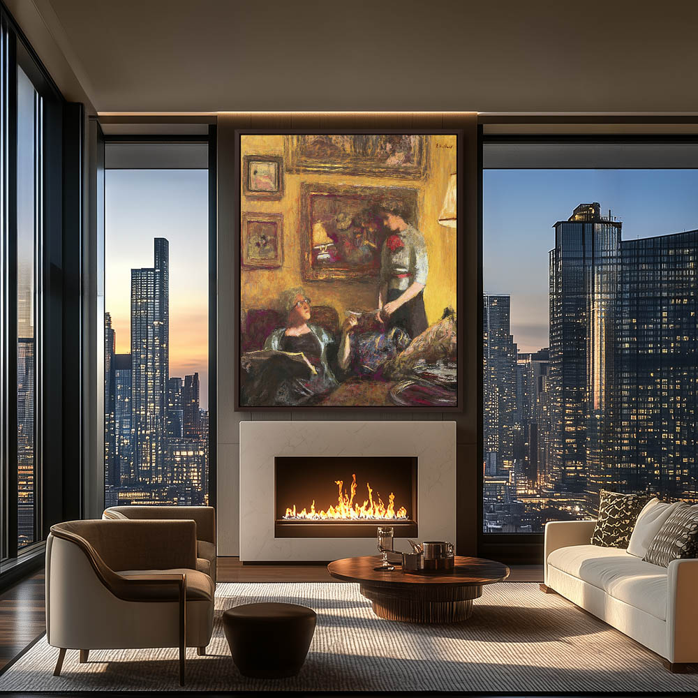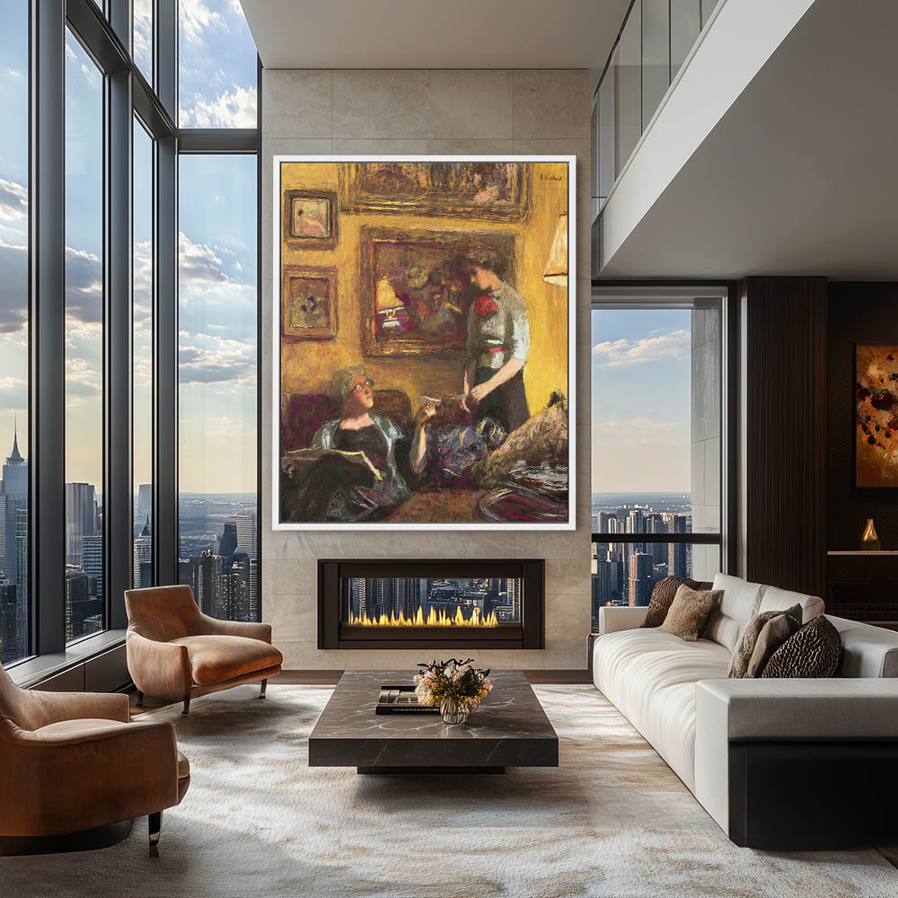 A younger woman handing a note to an older seated woman in a warmly lit yellow toned room; walls covered in paintings.
