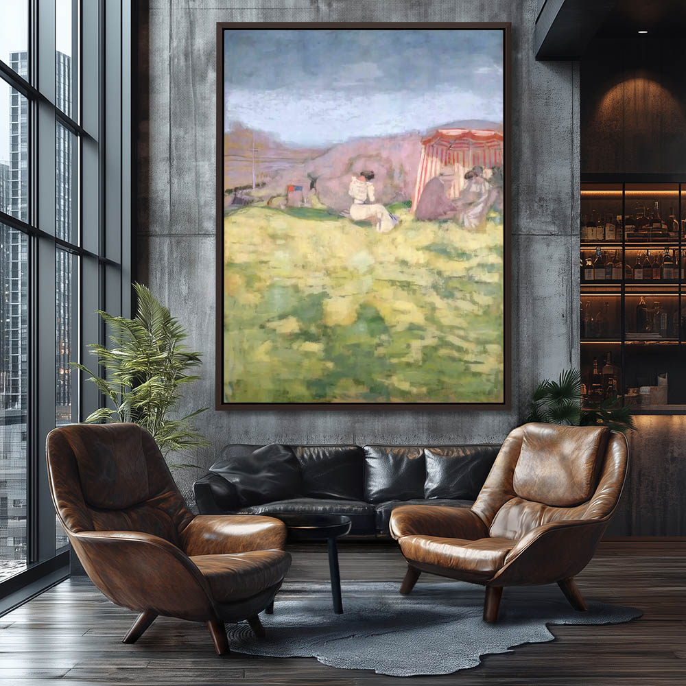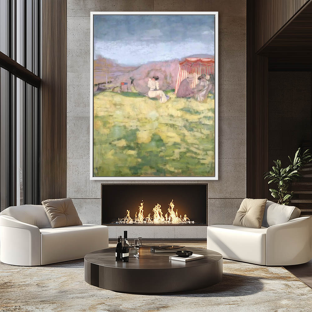 Figures gathered at a red and white striped tent on a grassy hill by the beach,