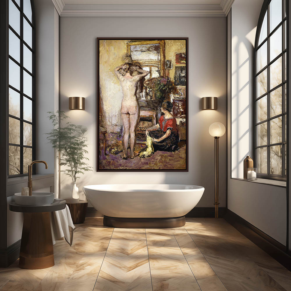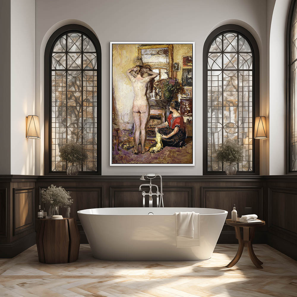 Female nude seen from behind, standing at a mirror with hands in her hair while another woman sits next to her on the floor.