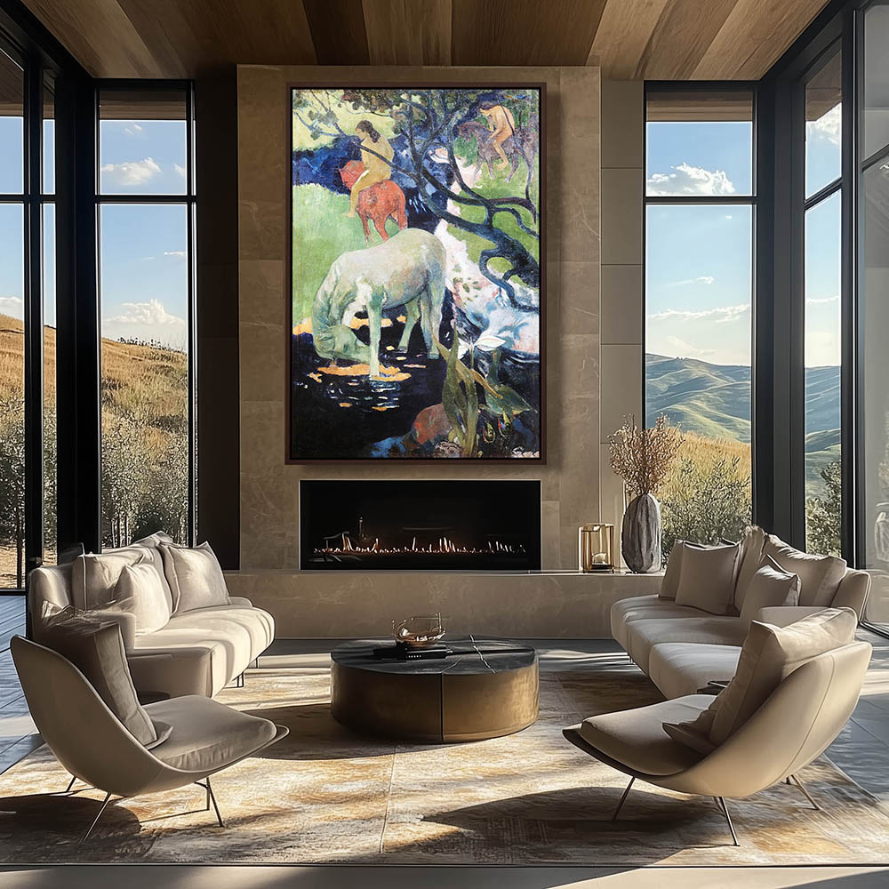 Vintage Landscape Painting with Two Horses and a Nude Rider