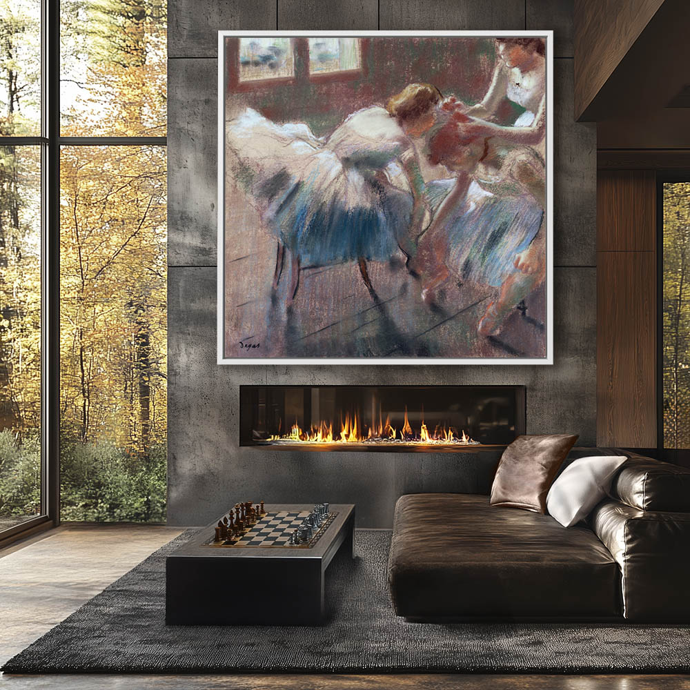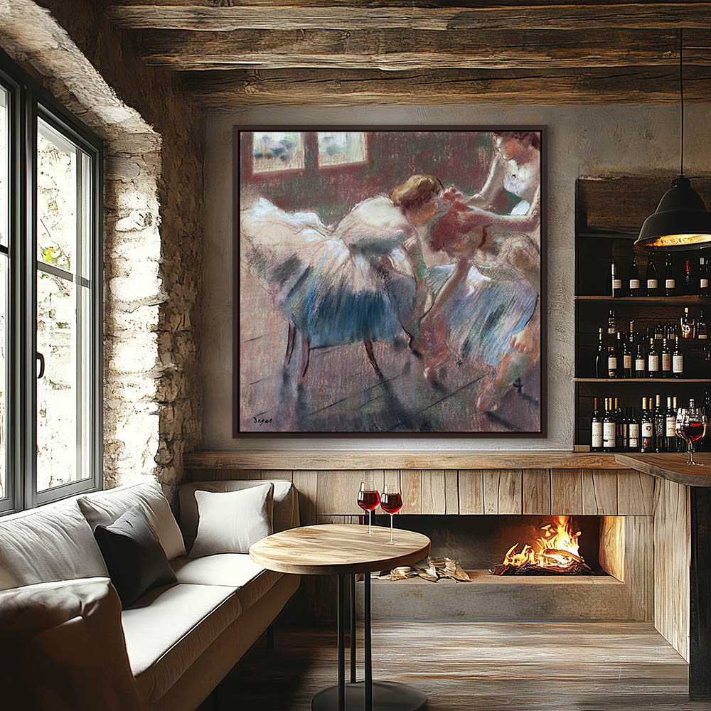 Three ballerinas tying shoes and pinning up one another’s hair for class