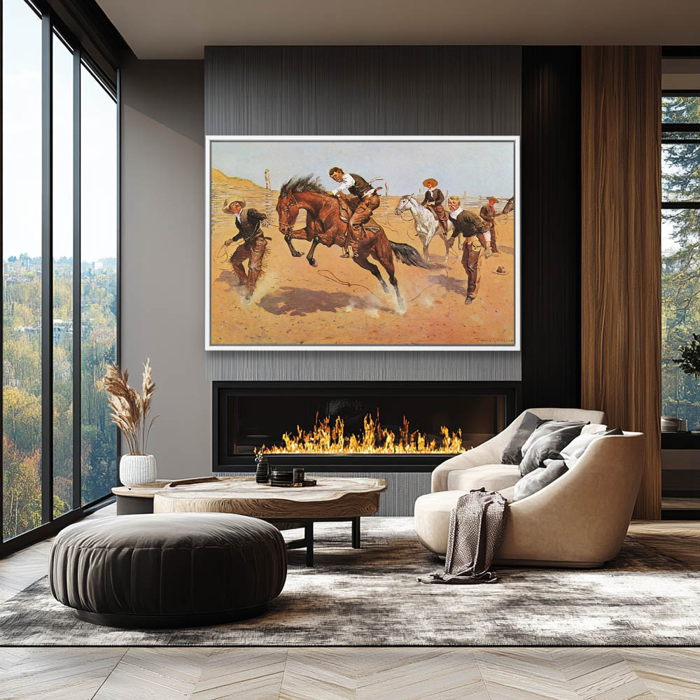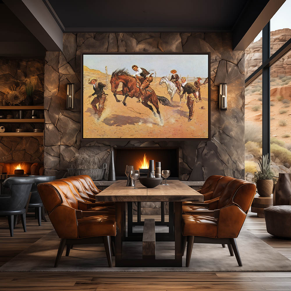 Cowboys in a coral breaking a horse