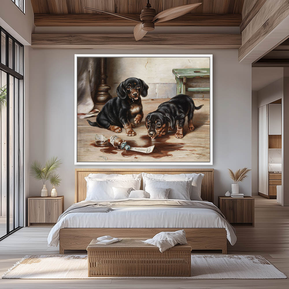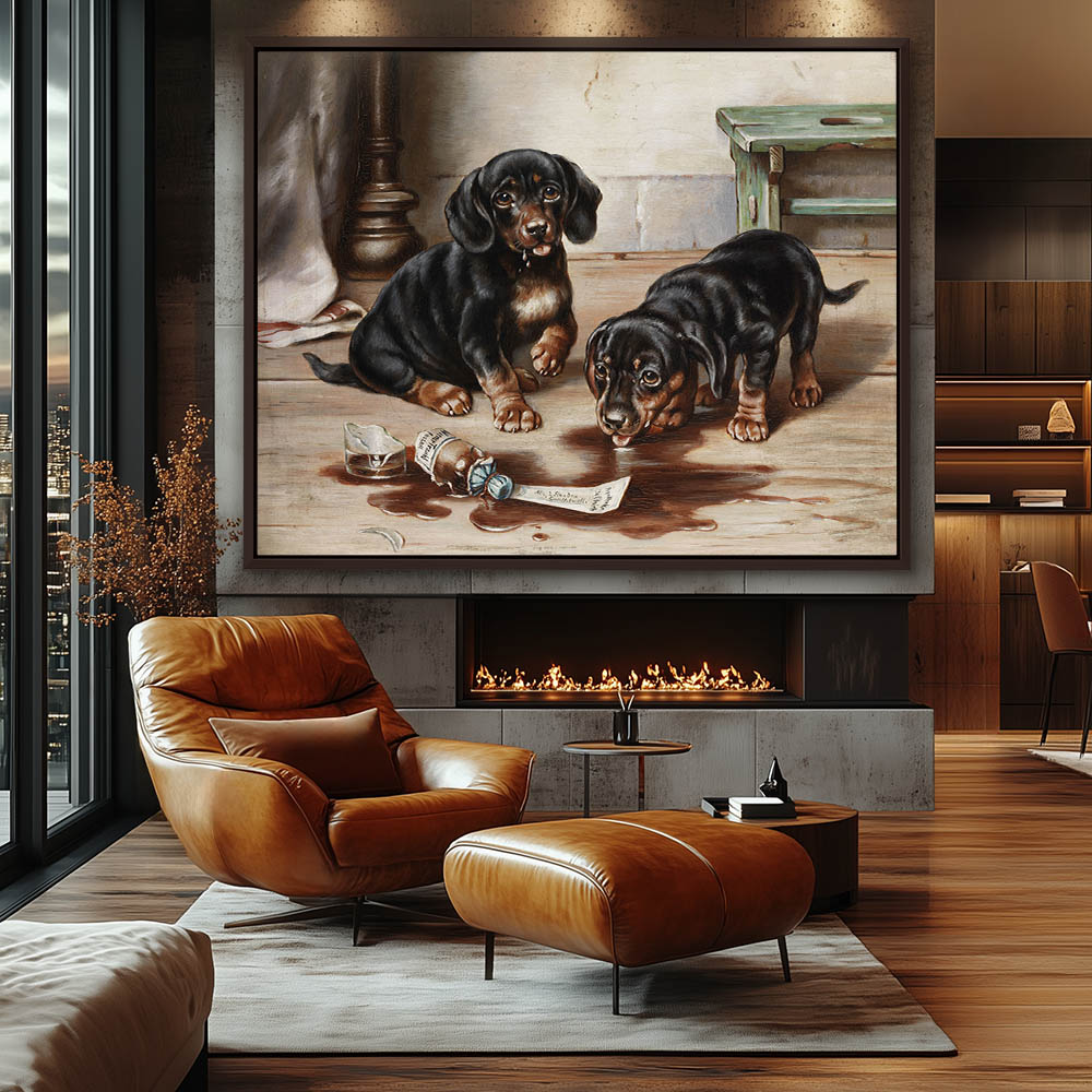 Two dachshund puppies and lapping up the contents of a broken apothecary bottle