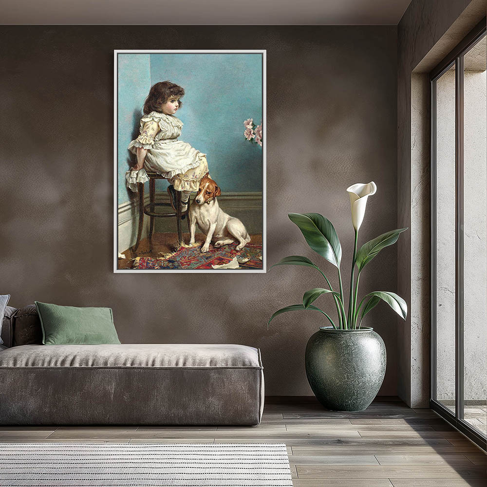 Young girl and a small dog, exiled to a stool in the corner after some mischief