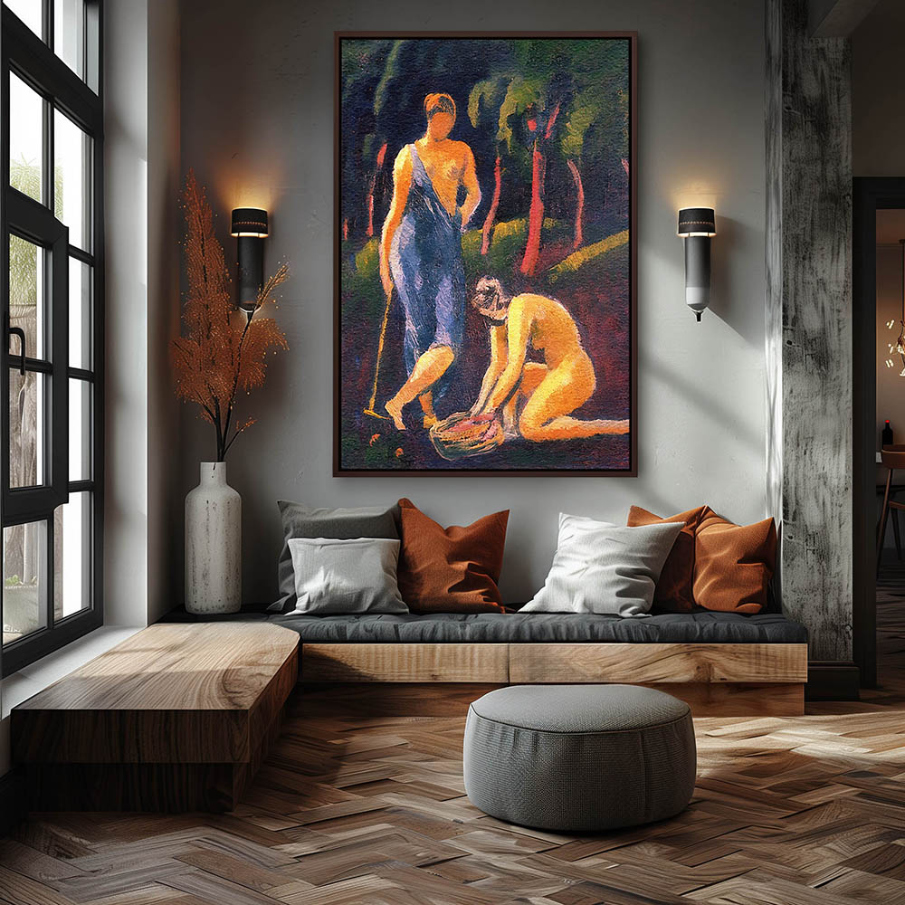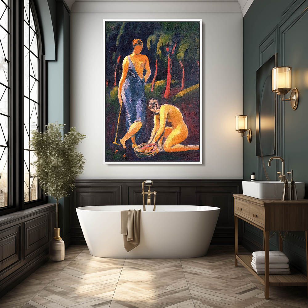 Abstract Figurative Painting with Two Nude Women Working in a Garden