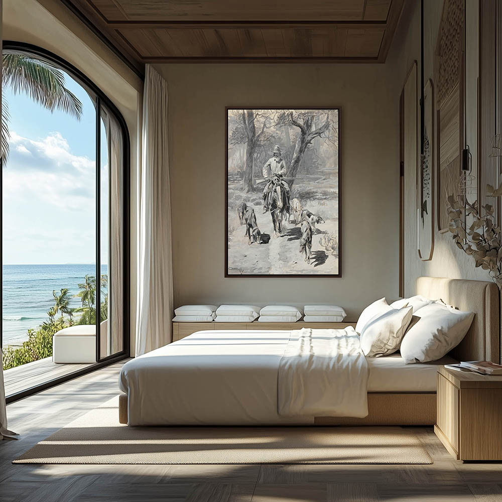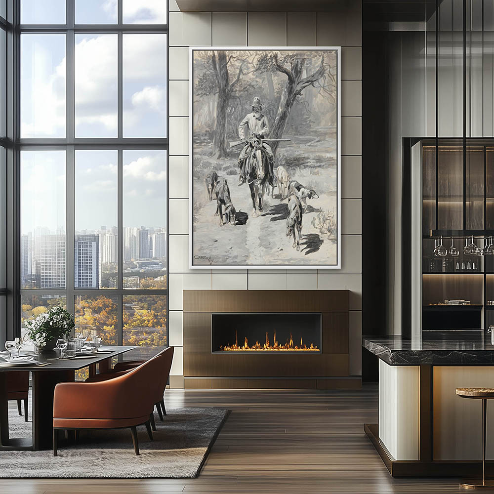 Hunter on horseback with a rifle across his lap and hunting dogs walking alongside