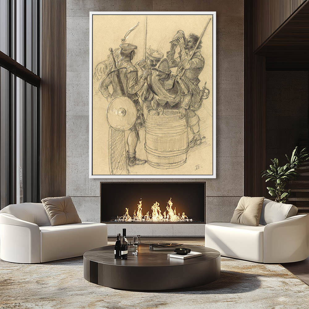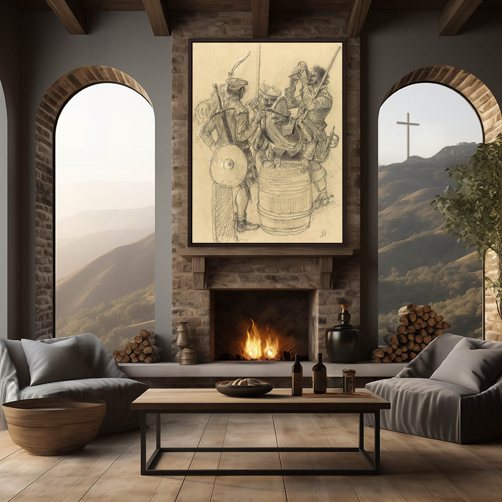 Drawing of soldiers getting water from a barrel