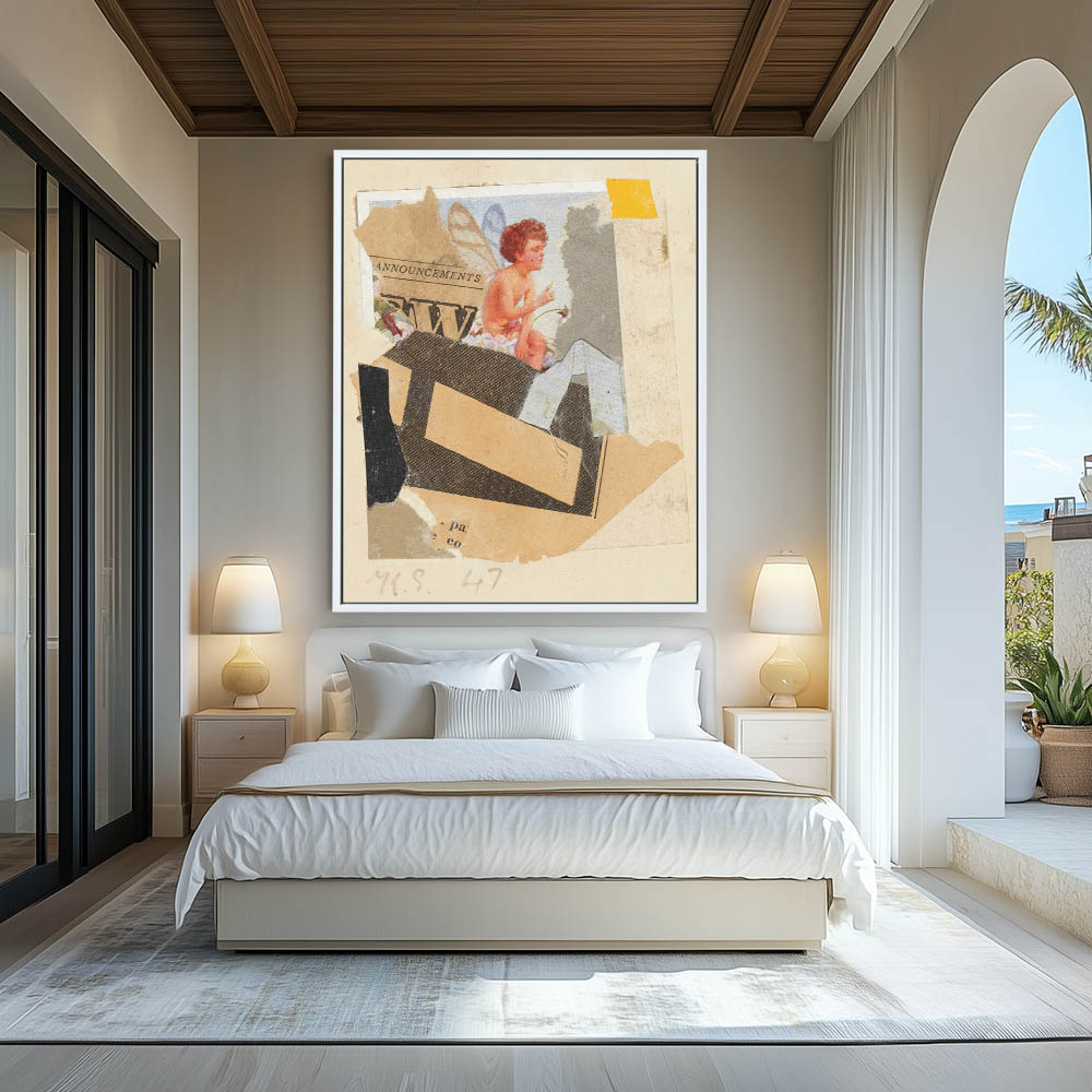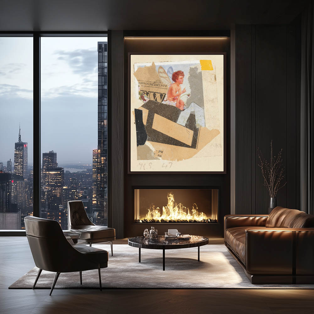 Abstract collage with newsprint and a print with a fairy child