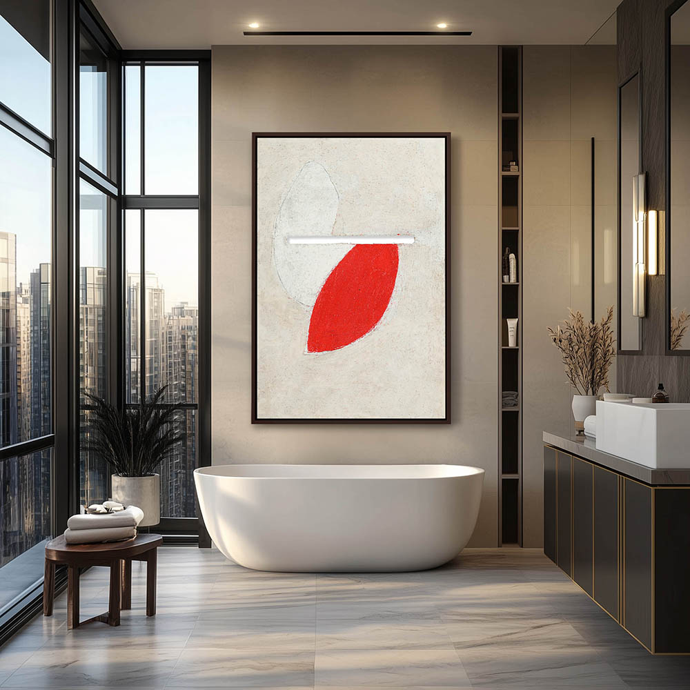 Curved red shape on a neutral background and a rectangular slit
