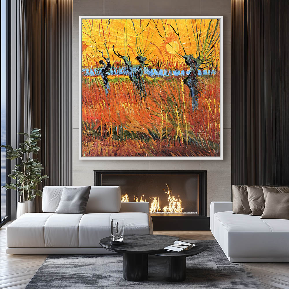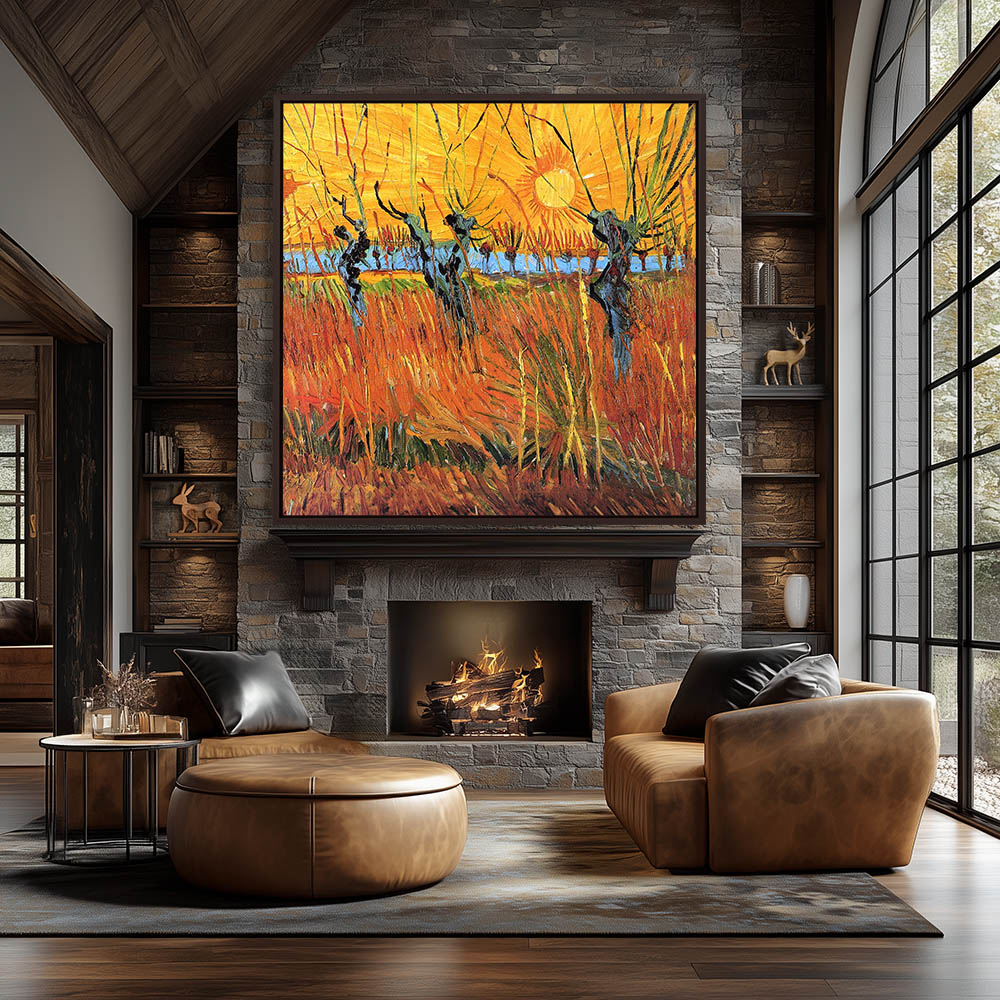 Vincent Van Gogh Paintings of an Abstract Landscape Painting with the Sun Setting, Wall Art for Home Decor in Canvas Wall Art Framed in Floater Frames, Metal Wall Art, Fine Art Prints, Framed Prints, Vinyl Wall Peels, Poster Art, Vintage Paintings