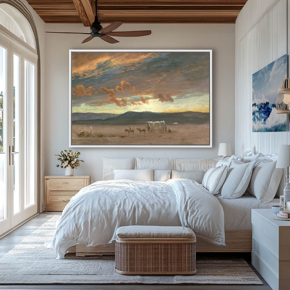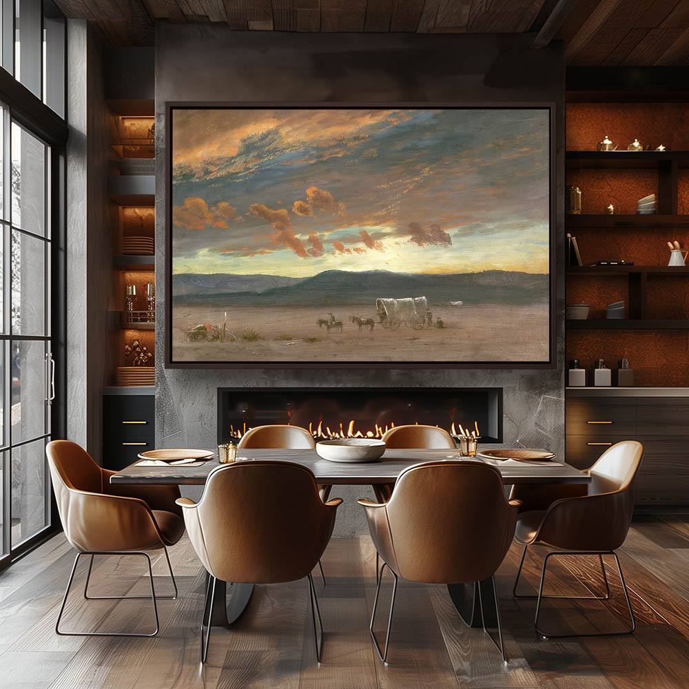 Sunset tinged clouds above a wagon train moving on an empty western landscape