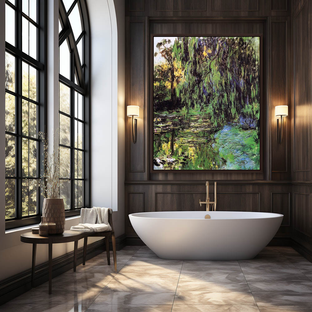 Vintage Landscape Painting of a Weeping Willow in a Garden with a Water Lillie Pond