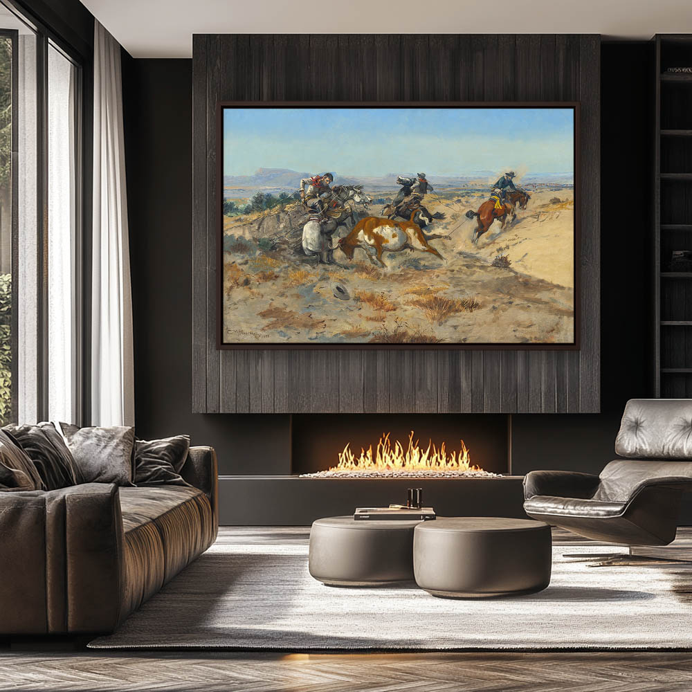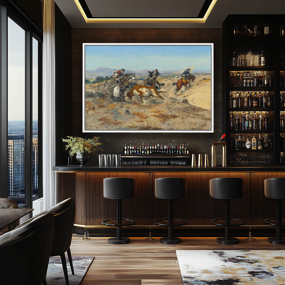 Cowboys trying to rope a wayward steer, but it’s not going well
