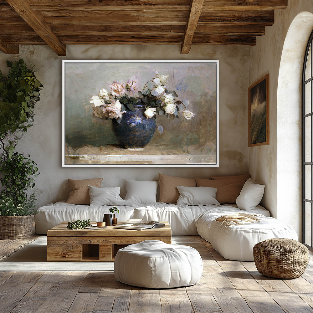 Vintage Still Life Painting with White Roses in a Ceramic Pot