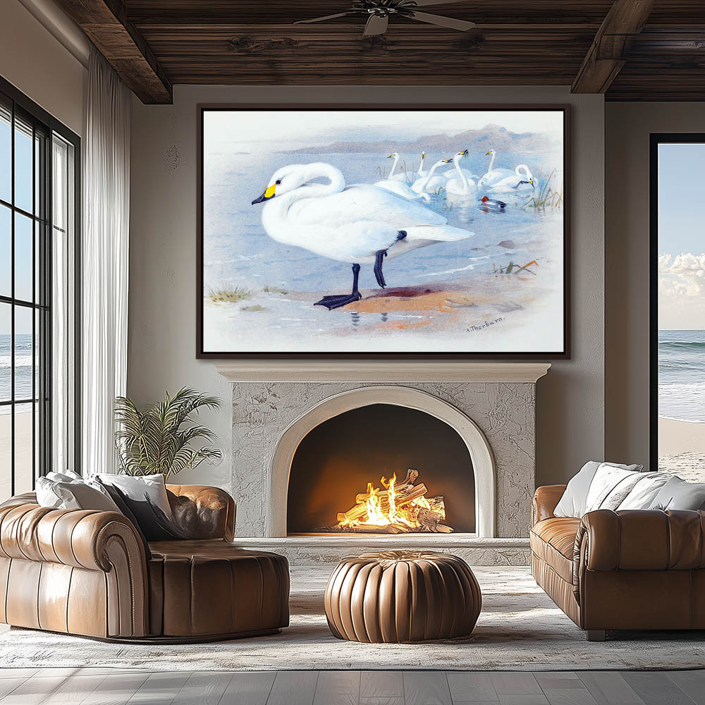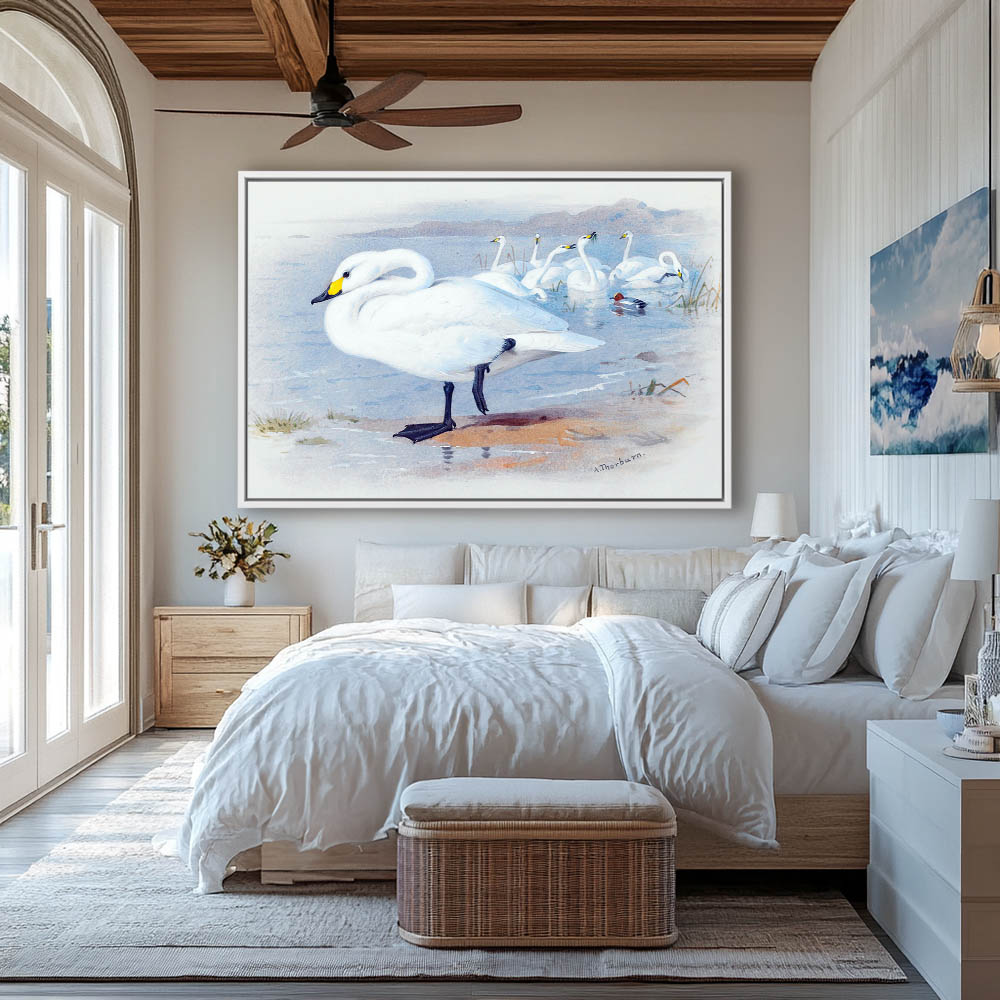 Painting of Swans in the Water and Walking on Shore