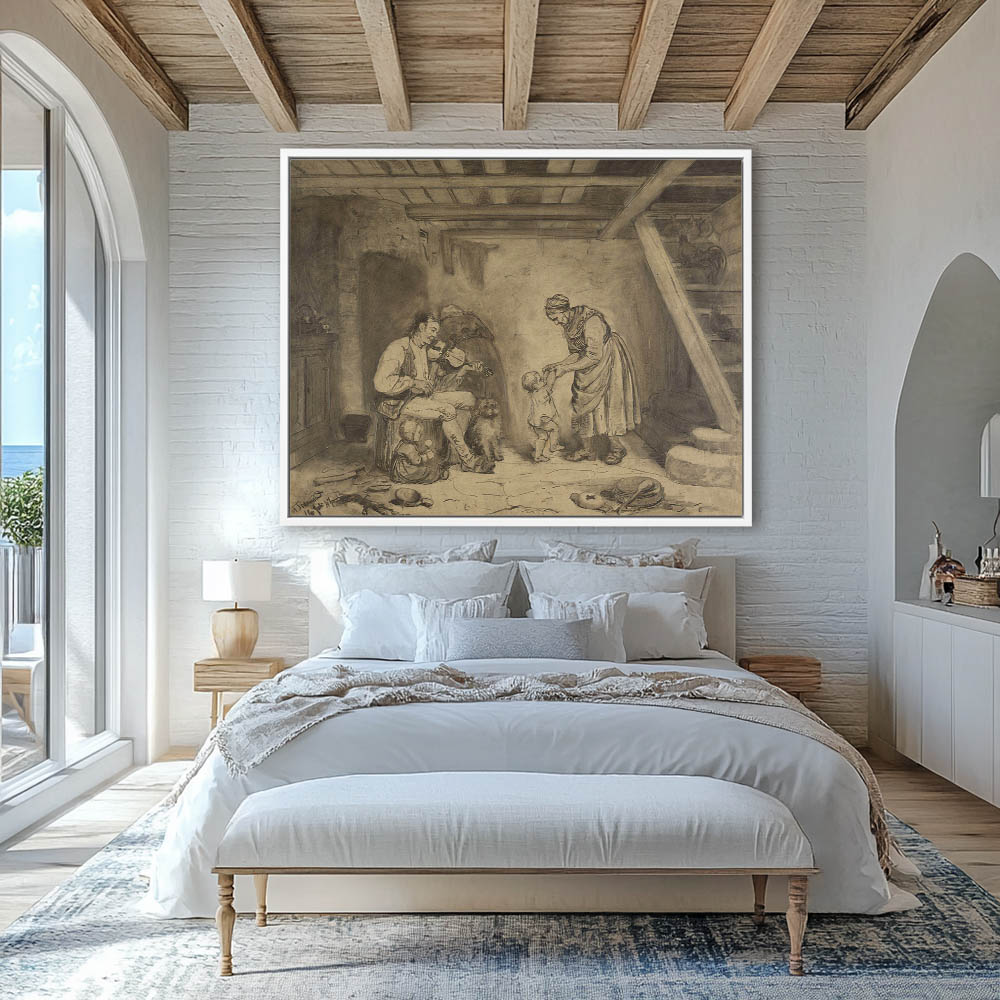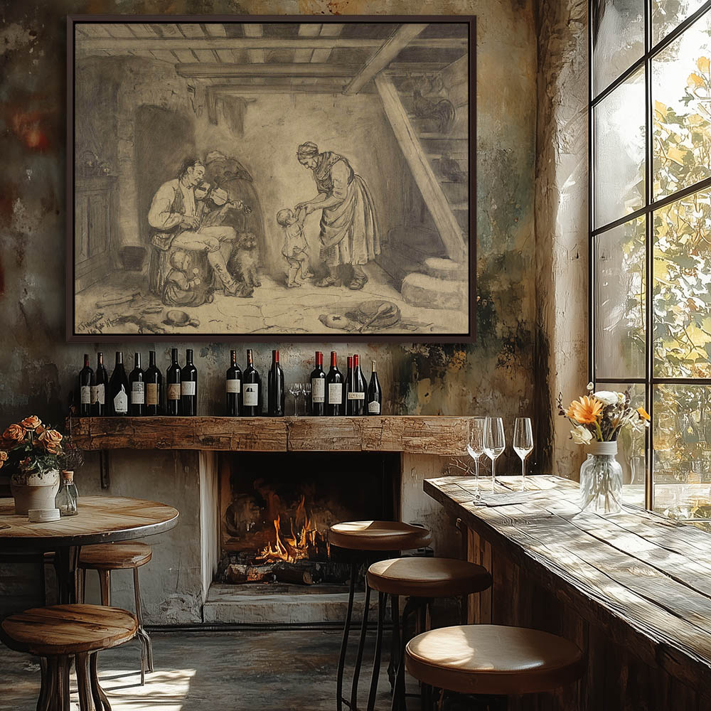Woman and child dancing to the man playing a fiddle inside a farmhouse