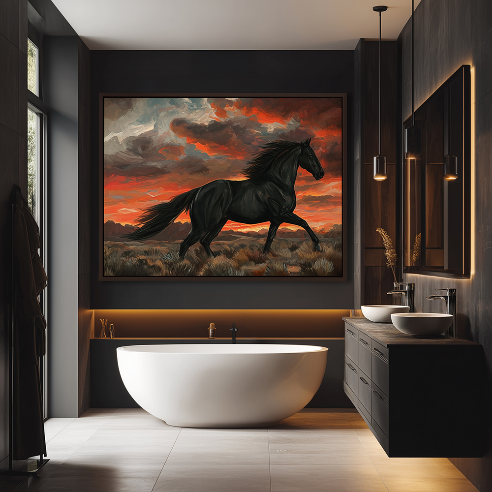 This striking black horse sunset painting captures the raw power and quiet elegance of a lone horse moving across an open landscape as the sky ignites with rich evening color. Rendered with expressive, painterly brushstrokes, the horse’s flowing mane and tail convey motion and grace, while its dark silhouette stands in bold contrast against the glowing horizon.