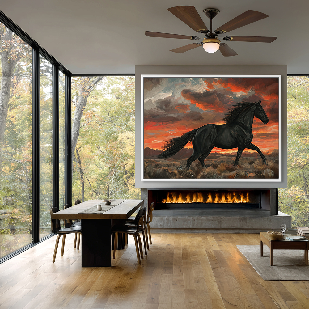 A powerful painting of a black horse in motion beneath a fiery sunset sky, capturing strength, freedom, and untamed beauty.