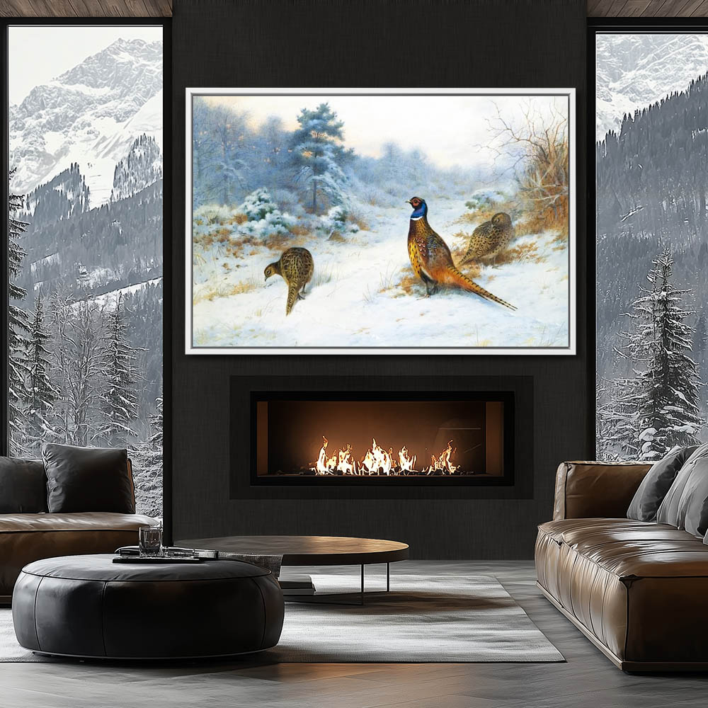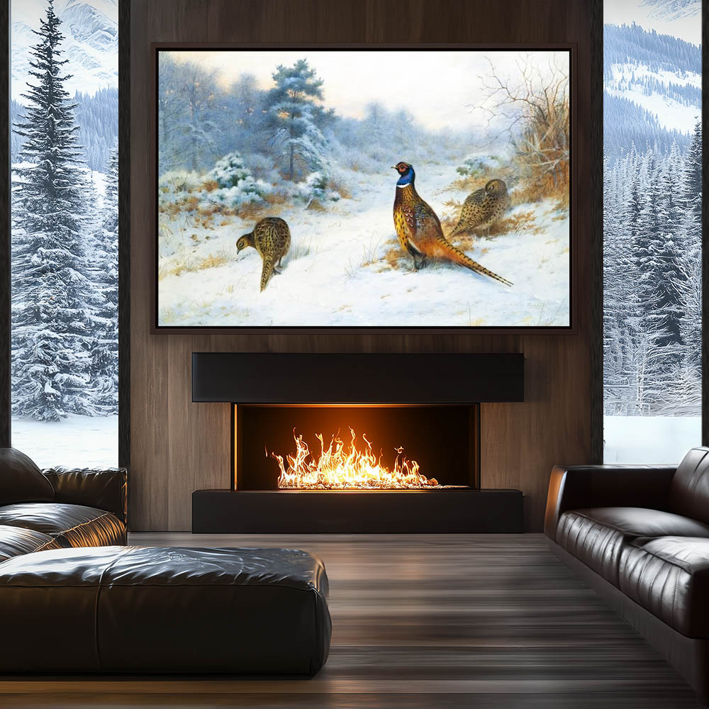Snowy Winter Landscape Painting with Cock and Two Hen Pheasants