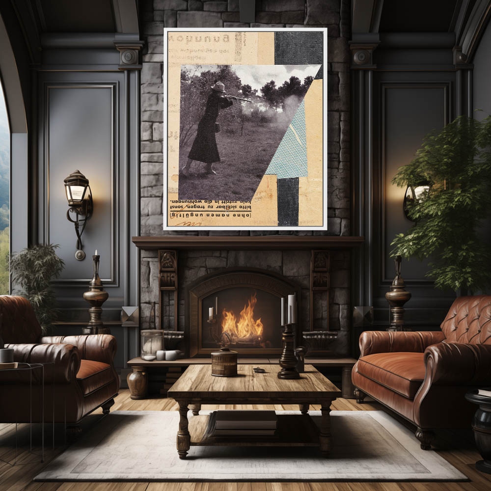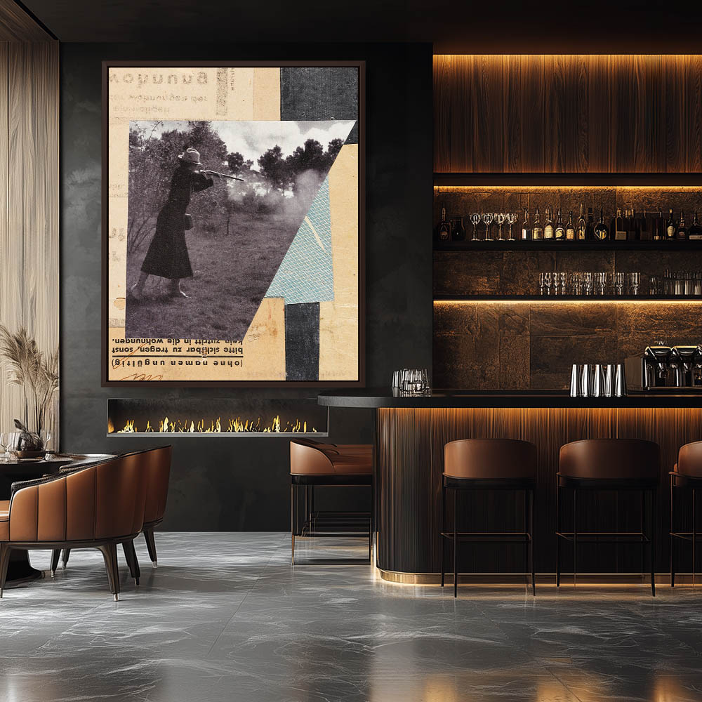 Abstract collage with colored paper and photograph of a woman with a rifle