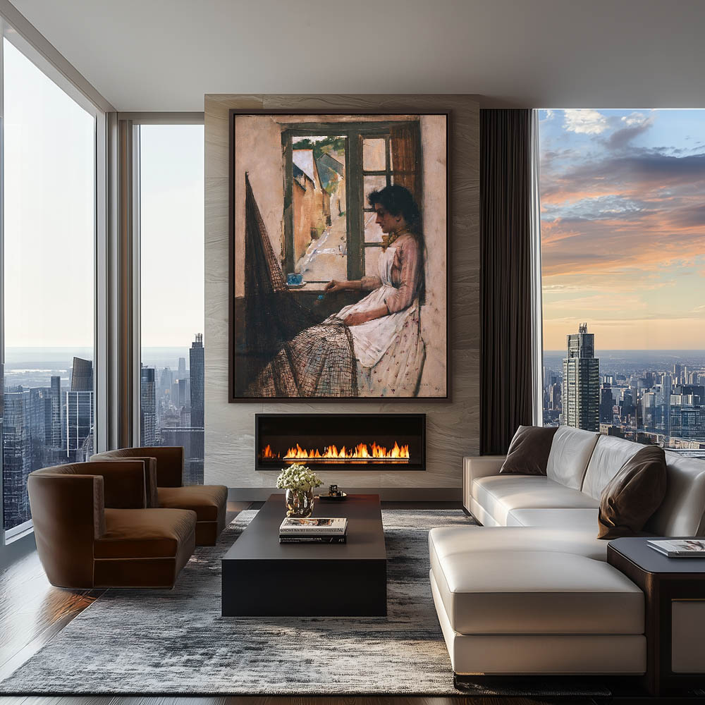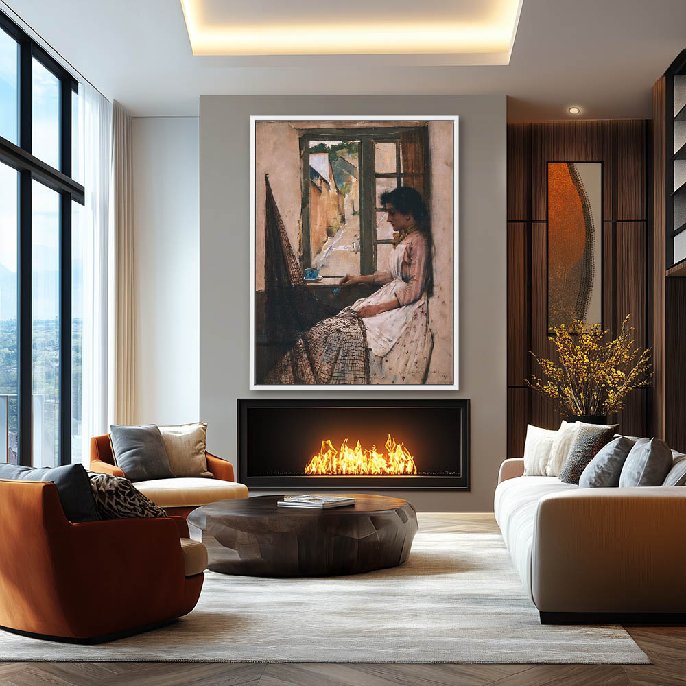 Interior Painting with a Woman Sitting by the Window Drinking Coffee